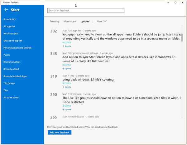 很多用户都对Win10的平板模式以及开始屏幕表示满意,因为无论从“颜值”还是功能上面都有走心的改进,比如平板设备自动识别、开始屏幕背景透明,以及开始屏幕左端整合开始菜单的形式等。但也有相当一部分从Win8.1升级而来的用户并不买账,这种情况在美国区《Windows反馈》中体现的尤为明显。