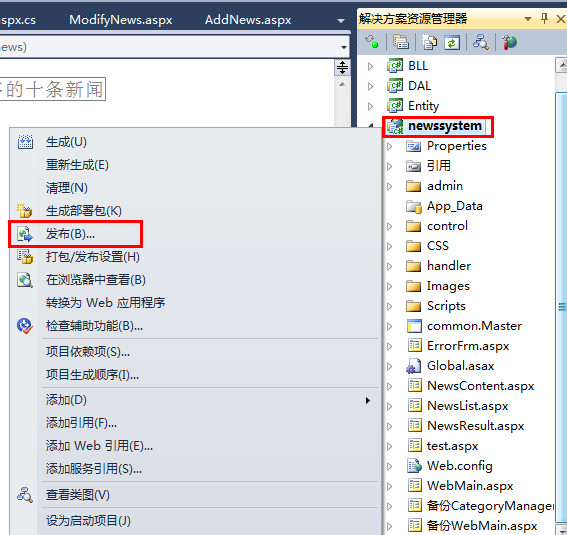 第一步:在解决方案资源管理器中右击Web应用程序名(例如:newsSystem)——》点击发布,如图所示:
