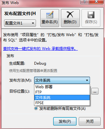 第二步:在弹出的对话框中,发布方法选:文件系统,目标位置自定义(如:选桌面的test文件夹),勾选“发布前删除所有现有文件”单选框,然后点击发布即可。如图: