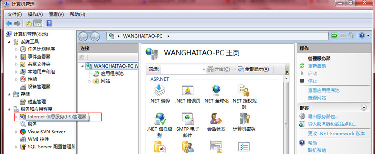 第三步:在IIS中发布网站。右击计算机——》管理,打开计算机管理窗口,点击“服务和应用程序”下的“Internet 信息服务(IIS)管理器”,如图所示: