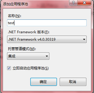 第四步:右击应用程序池,添加应用程序池,在弹出的“添加应用程序池”窗口中,填写名称,.NET Framework 版本根据你开发程序用到的.NET Framework版本定,确定即可。