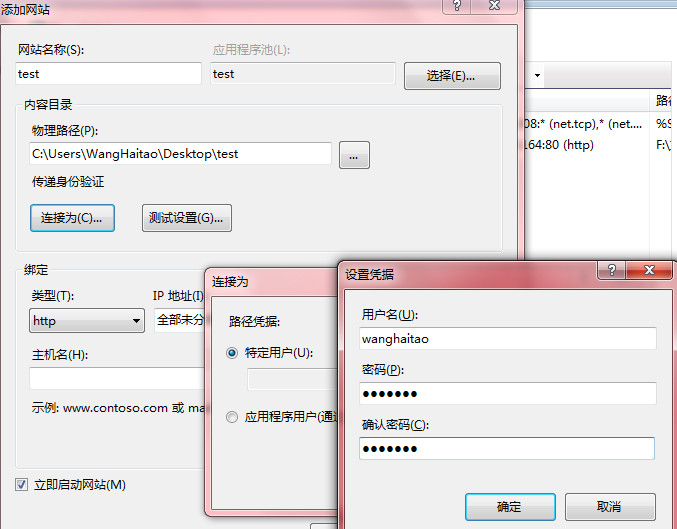 第五步:右击“网站”,添加网站,在“添加网站”窗口中,填写网站名称,应用程序池选上一步新建的应用程序池,物理路径指向第二步输出的文件夹,“链接为”选特定用户,并输入你的用户名和密码,IP地址填本机IP。确定即可。如图所示: