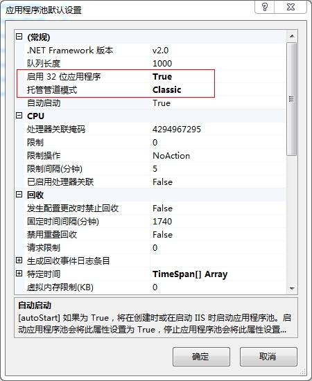 解决办法:打开IIS,选择应用程序池,会看到右侧的操作栏中有一项为【设置应用程序池默认设置】,点击进入,把【启用32位应用程序】置为true,把【托管管道模式】置为Classic。如图