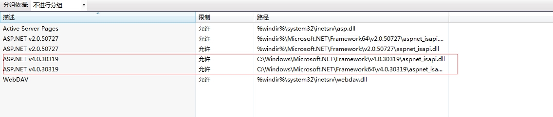 解决办法:打开IIS,选择根目录,双击【ISAPI和CGI限制】这项,然后将【ASP.NET v4.0.30319】这两项均设置成允许。如图