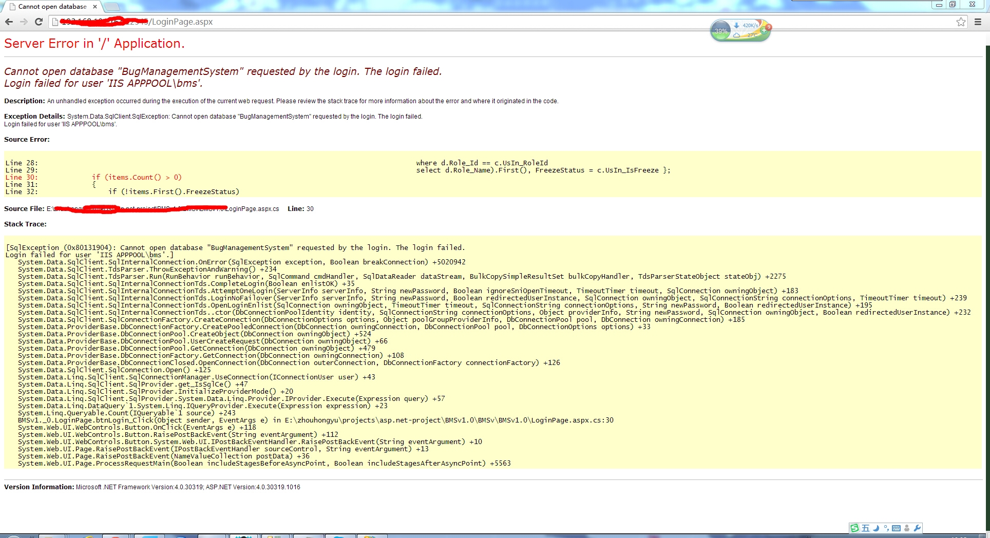 解决办法:这个问题刚出来的时候有点懵,以为是IIS设置的问题,后来仔细一瞅,隐隐觉得似曾相识,通过查看数据库连接,发现果然是连接数据库上出现了问题,跟IIS设置无关。