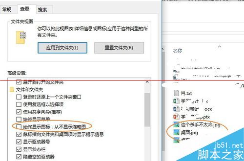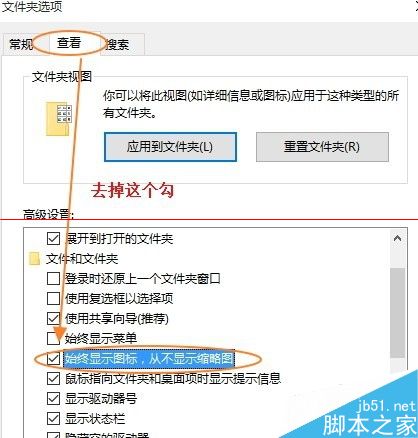 2、正常情况下,在“查看”--->“选项”--->“更改文件夹和搜索选项”--->“查看”--->“高级设置”--->把“始终显示图标,从不显示缩略图”前面的勾去年即可。
