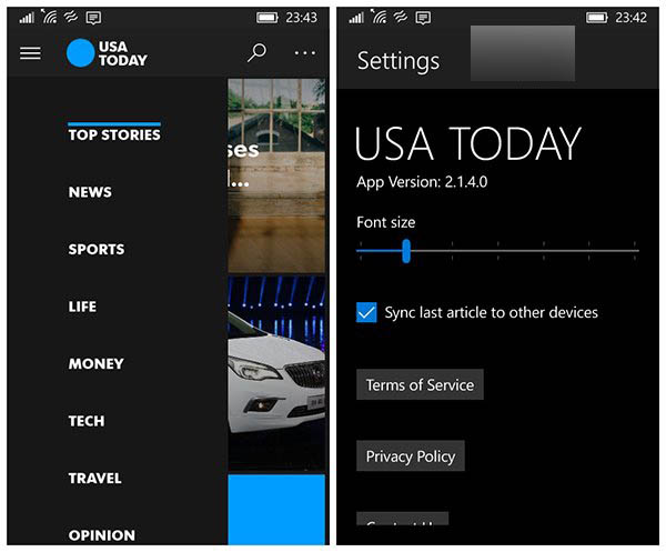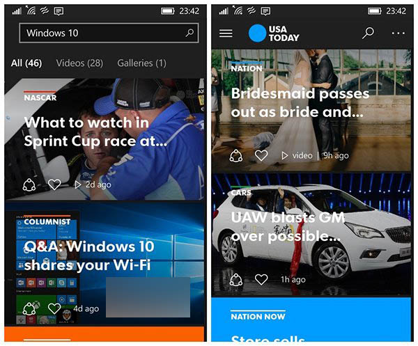 《今日美国》是微软推广Win10的示范通用Windows应用,内容包括新闻、体育、生活、财经、教育等等,该应用还提供搜索文章标题、类别,甚至是视频功能。另外还可以保存文章,在不同的Win10设备之间同步阅读进度等,并且支持动态磁贴。