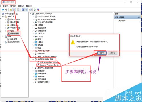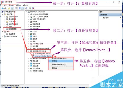 2、弹出【计算机管理后】找到【设备管理器】后【单机左键】,找到【鼠标和其他指针设备】后单机找到【lenovo Point...】右键【卸载】