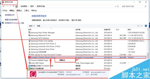 4、在弹出的【控制面板】下找到【程序】→【卸载程序】→找到【synaptics pointing device driver】右键【卸载】→单机【确认】→卸载后【重启】计算机。
