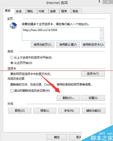 2、进入internet设置对话框,点击浏览记录下方的【删除】选项