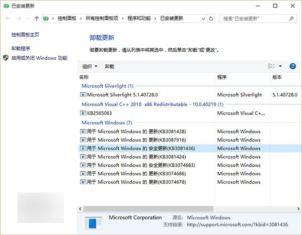卸载方法很简单,点击设置→更新和安全→高级选项→查看更新历史记录→卸载更新,然后在弹出的窗口中找到KB3081436后,双击卸载即可。