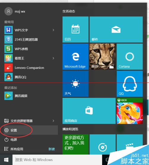 2、在【开始】菜单下,点击选择【设置】选项。(如图所示)