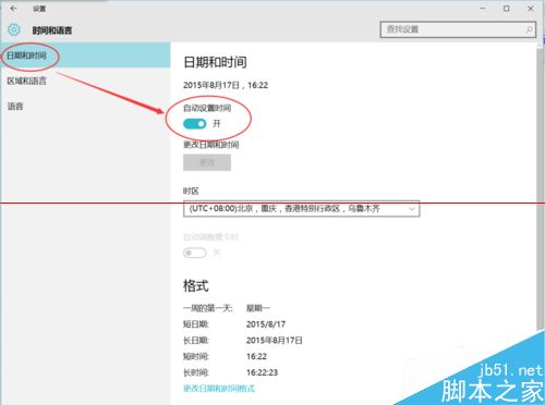 4、在【时间和语言】选项下,点击选择【日期和时间】选项,打开【自动设置时间】开关完成设置。(如图所示)