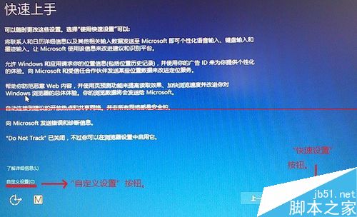 在如图的页面里,简单的点击“使用快速设置”按钮省时省力,但是使共享语音、输入、联系人、日历、地点和广告 ID 等信息成为可能。如果在意这些信息的安全性,那就点击左边的“自定义设置”(字比较小,所有必须有但又不愿让你看见的内容,都这德性)。