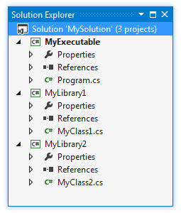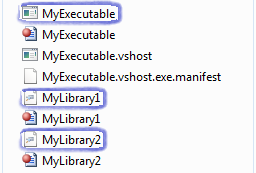 注意 MyExecutable 的项目文件 (MyExecutable.csproj)是一个基于XML的文件,而如果我们查看它的内容,会发现一些ItemGroup节点. 这些节点博阿含定义了构建过程输入的子元素. 这些子元素可以引用需要被编译的应用程序的资源文件, 或者是一些需要被复制的资源,以及需要在构建处理中被包含进去的程序集 (如果对此感兴趣,你可以在MSDN MSBuild上了解到更多有关Visual Studio项目文件的信息).