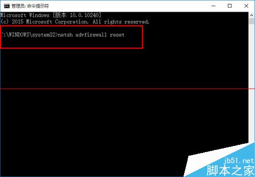 2、完了后,再次输入:“netsh advfirewall reset” ,回车。