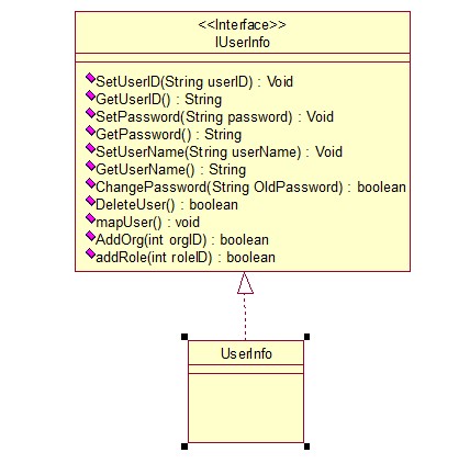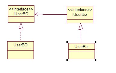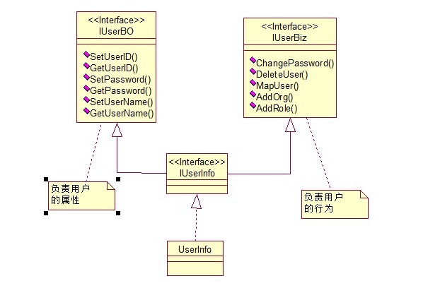 重新拆分成两个接口,IUserBo 负责用户的属性,IUserBiz负责用户的行为。当我们实例化除UserINfo这个对象后,我们可以把UserInfo当做IUserBo实现类使用也可以将它当做IUserBiz的实现类使用,这就要看我们用在什么地方了。如果是获取用户信息,就把UserInfo 当做IUserBOSS的实现类,如果是维护用户信息,就当做是IUserBiz的实现类。在实际应用中我们更倾向于把一个接口拆分成两个,一个是IUserBO一个是IUserBIz。类图如下。