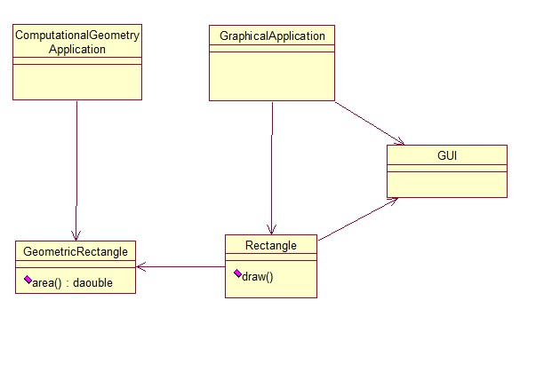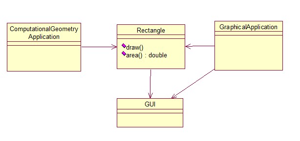 Rectangle拥有两个方法,一个方法是draw,用来画图形,另一个方法是area用来计算面积。Rectangle违背了单一职责原则,因为它具有两个职责:计算面积与绘制矩形。绘制图形会与用户界面有关,但是计算图形面积却未必与界面有关,如果把这两个职责写到一个类中,那么如果只需要使用area()方法这一职责来计算面积,那就不得不把draw()方法一同编译,但是却可能也用不到它。如果其中一个职责需要修改,就不得不重新编译和部署另外一个。如果类的职责超过一个,这些职责之间就会产生耦合。改变一个职责,可能会影响和妨碍类为其它类服务的功能。把两个职责分开会好一些。