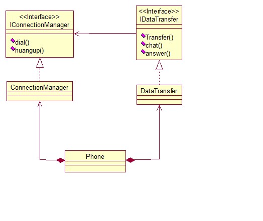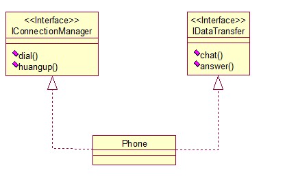 这样设计才完美,一个手机实现两个接口,把两个职责融合一个类中,虽然你会觉得这个phone类有两个原因引起变化,但是我们是面向接口编程,对外公布的是接口,而不是实现类。如果非要使得类符合单一职责原则,那么就要使用上一个类图了,但是这样的话类的耦合性就增加了.