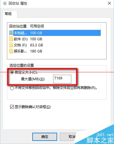 3、下方的“自定义大小”可以自己设置回收站的大小,输入适当的数值即可。