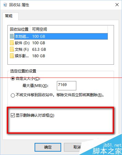 5、也可以设置在删除文件时是否显示删除确认对话框,把勾去掉在删除文件的时候就直接被删除了,不会又确认框。