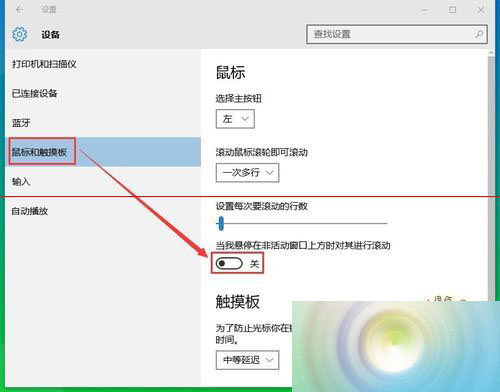 3、在设备窗口中点“鼠标和触摸板”选项卡,将“当我悬停在非活动窗口上方时对其进行滚动”开关关闭(如图),关闭设置窗口,去Creo等软件中试试吧。