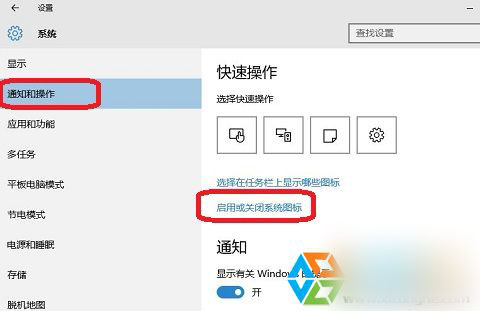 3、“设置”界面的左侧定位到“通知和操作”,右侧窗口中选择“启用或关闭系统图标”,如图: