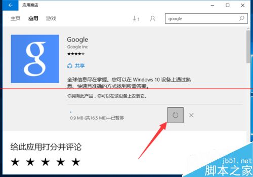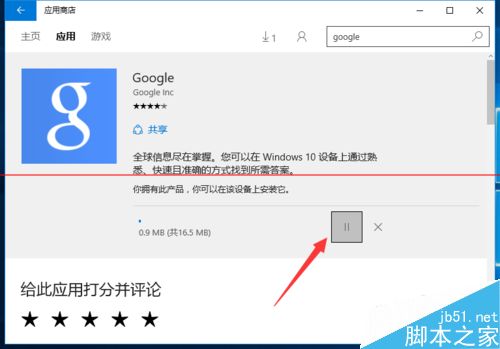 5、接下来返回“Win10应用商店”应用下载界面,点击“暂停”按钮,以暂停当前应用的下载操作。