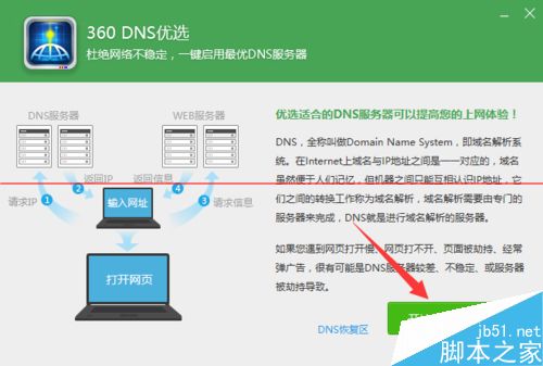 2、此时将自动安装并运行“dns优选”工具,从弹出的如图所示的窗口中,直接点击“开始优化DNS”按钮。当然,对于优化dns操作后所造成的其它故障,也可以通过在此界面中点击“dns恢复区”来还原之前的DNS设置。