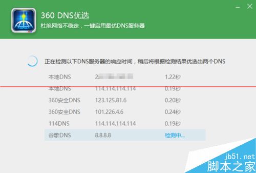 3、接下来“dns优选”工具将自动检测多个相关DNS,并从中找到“延时最短”、“稳定性最好”的DNS信息。