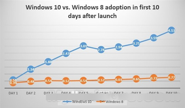 相比之下,Windows 8的增长速度简直可以用蜗牛来形容,十天只增长了0.38个百分点而达到0.77%。换言之,Windows 10只用两天就彻底羞辱了Windows 8。