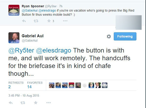 接着网友找到了关键,“如果你在外面度假,那么谁来按下推送Win10 Mobile的红色大按钮呢?”Gabe表示,“重大决策按钮在我手中,可以远程遥控。手边的公文包已经磨得.....”