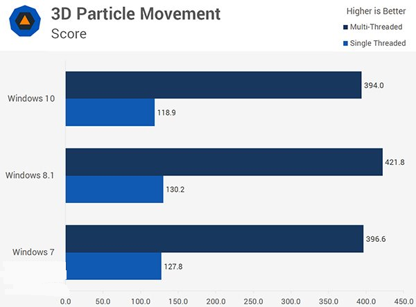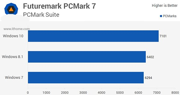 一般来说,此项测试会有5%的误差范围,在上图的数据处理中已经被计算在内。从这项评比结果来看,Win10比Win8.1稍强一点,但优势并不明显,而相比于Win7而言就更加突出一些。