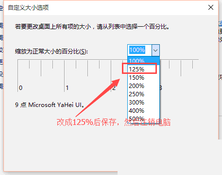 5、然后把---缩放比列改到125%,确定保存后注销电脑即可。
