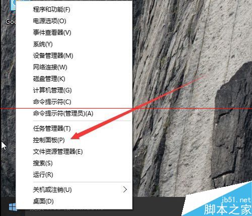 2、然后右键点击Windows10桌面左下角的徽标,在弹出菜单中选择“控制面板”菜单项