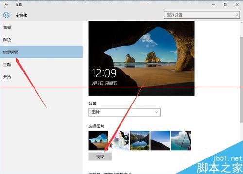 7、打开“个性化”设置界面,点击左侧的锁屏界面菜单项,在右侧选择图片一项中点击“浏览”按钮,找到上面我们保存好的图片。