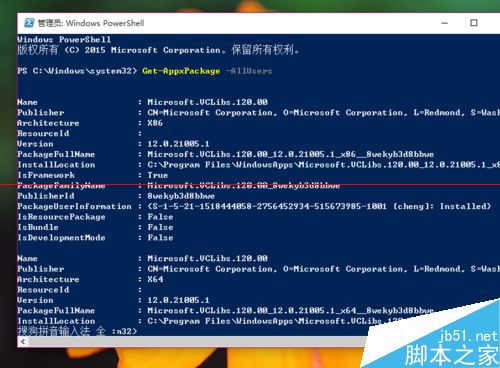 3、在接下来打开的Powershell命令窗口中,点击输入以下命令程序:Get-AppxPackage -AllUsers 然后回车,电脑系统将自动列出所安装的全部应用。