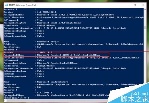 6、我们在这里可以看到人脉应用的完整包信息名称,PackageFullName意思就是完整的应用包名称,当卸载该应用的时候需要输入该完整名称。不过我们可以直接复制该名称,按下Ctrll+C键即可,