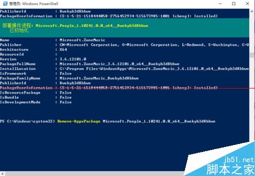 7、在Powershell程序窗口命令中,输入Remove-AppxPackage PackageFullName,后面的PackageFullName就是我刚才说过的完整包名称,如果你要卸载人脉应用。需要输入:Remove-AppxPackage Microsoft.People_1.10241.0.0_x64__8wekyb3d8bbwe。