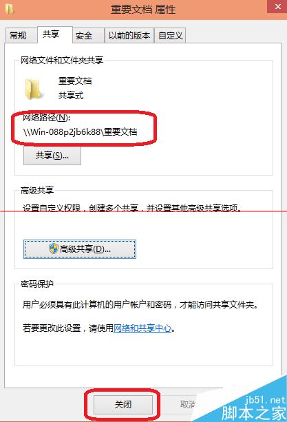 4、这里可以看到网络路径是共享的,单击高级共享。