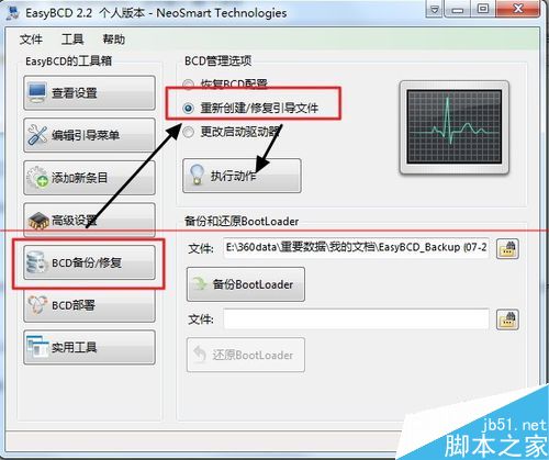2、 运行软件,选择:BCD备份/修复 —— 选择:重新创建/修复引导文件 —— 执行动作