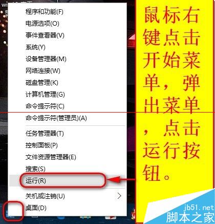 2、鼠标右键点击开始按钮,弹出菜单选择运行按钮