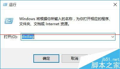 3、在运行按钮对话框中输入dxdiag命令,点击确定