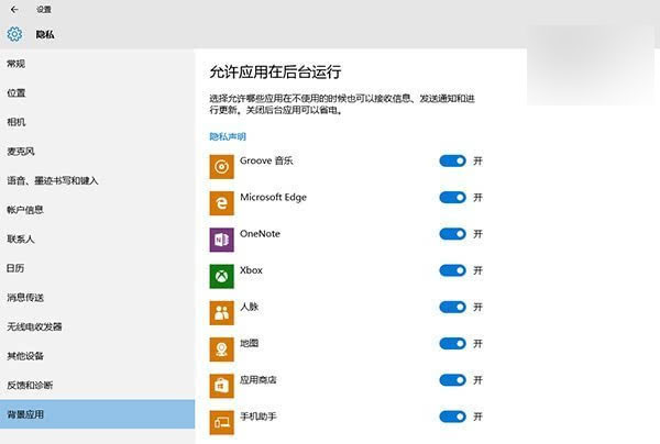 开始菜单点击设置,选择隐私,点击左侧的“背景应用”(注:应为后台应用,此处翻译有误),关闭不需要在后台运行的应用即可。