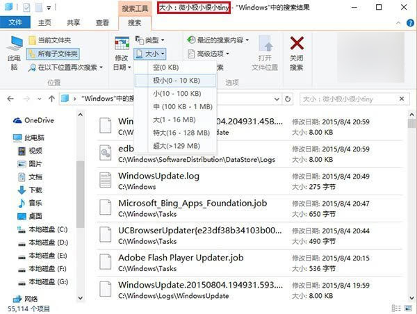 同样使用文件大小筛选,当你选择“极小(0 - 10 KB)”后,标题栏的表现比选择“超大”时“更胜一筹”:这次是用4个连续的中英文词汇“ 微小极小很小tiny”来表达对于“极小”的理解。