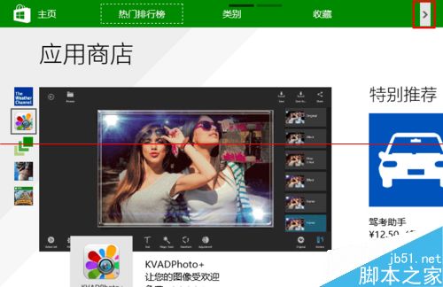 2、进入应用商店的主页后,将鼠标移动到顶部,这时会在顶部的右方出现一个向右的小箭头。点击这个箭头。
