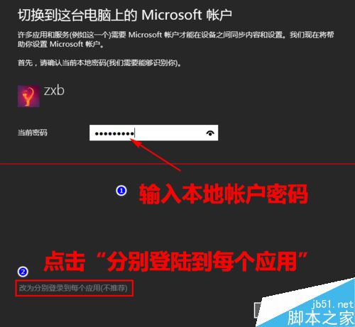 6、接下来,输入你的本地帐户密码。然后点击左下角的“改为分别登录到每个应用(不推荐)”。注意,不要点击“下一步”。