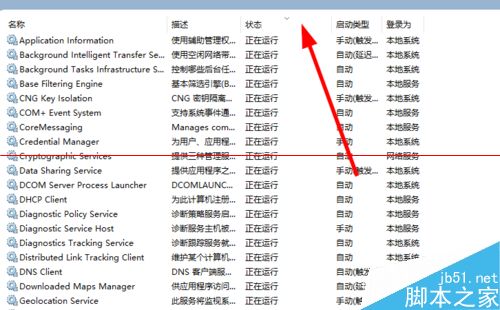 3、在服务窗口列出了系统的所有服务,有运行的,也有停止的,可以点击“状态”列对服务的状态进行排序,如图所示,这样就可以清楚的看到那些服务正在运行
