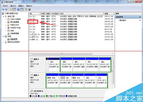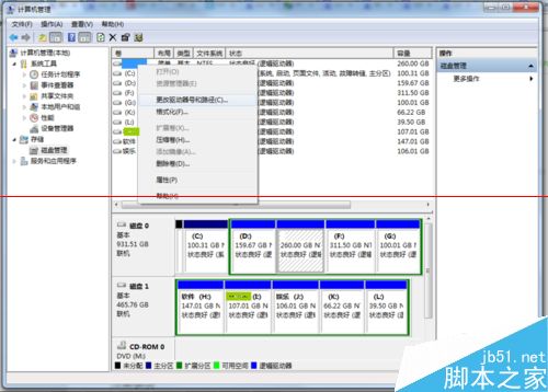 3、进入计算机管理界面我,我们找到【磁盘管理】,在被Windows7识别为系统盘的盘符下【右键】→【更改驱动号和路径】