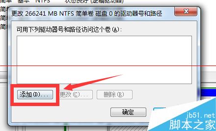 8、看到这个界面后选择【添加】,选择我们前面记住的盘符,再点击【确定】